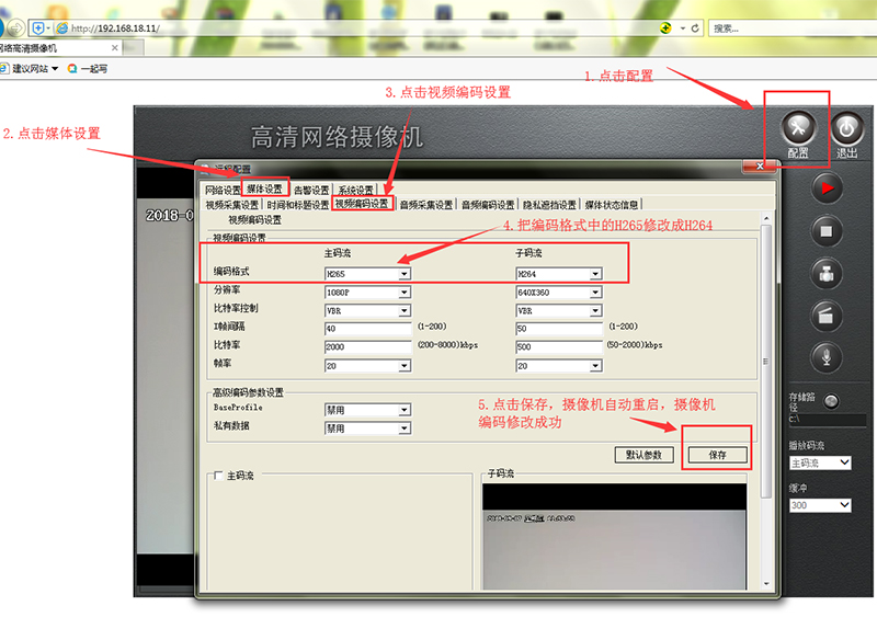 2.點擊“配置”,選擇“媒體設(shè)置”到“視頻編碼設(shè)置”,將編碼格式中的H265格式修改成H264格式,點擊保存即可