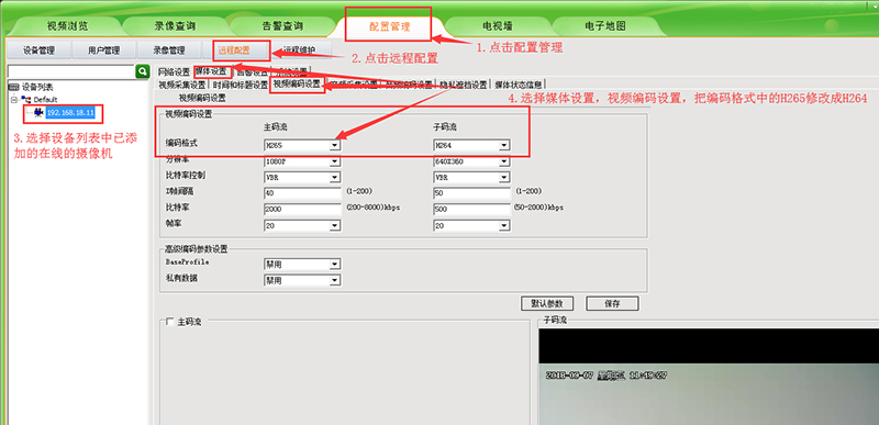 1.先將需要修改的攝像機IP添加到電腦客戶端中,然后點擊“配置管理”-遠程配置-在左邊設(shè)備列表中選擇已經(jīng)添加到客戶端的攝像機IP-選擇“媒體設(shè)置”到“視頻編碼設(shè)置”,將編碼格式中的H265格式修改成H264格式,點擊保存即可