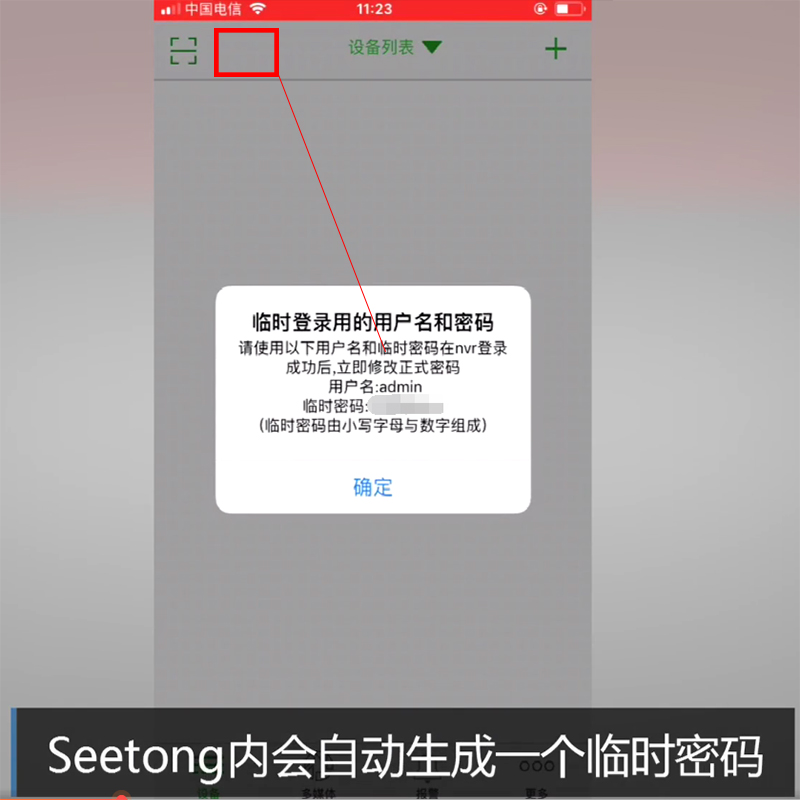 4.掃描后“seetong”會生成一個臨時的密碼,在硬盤錄像機(jī)的登錄界面輸入臨時密碼,登陸成功后按照提示重新設(shè)置密碼即可。