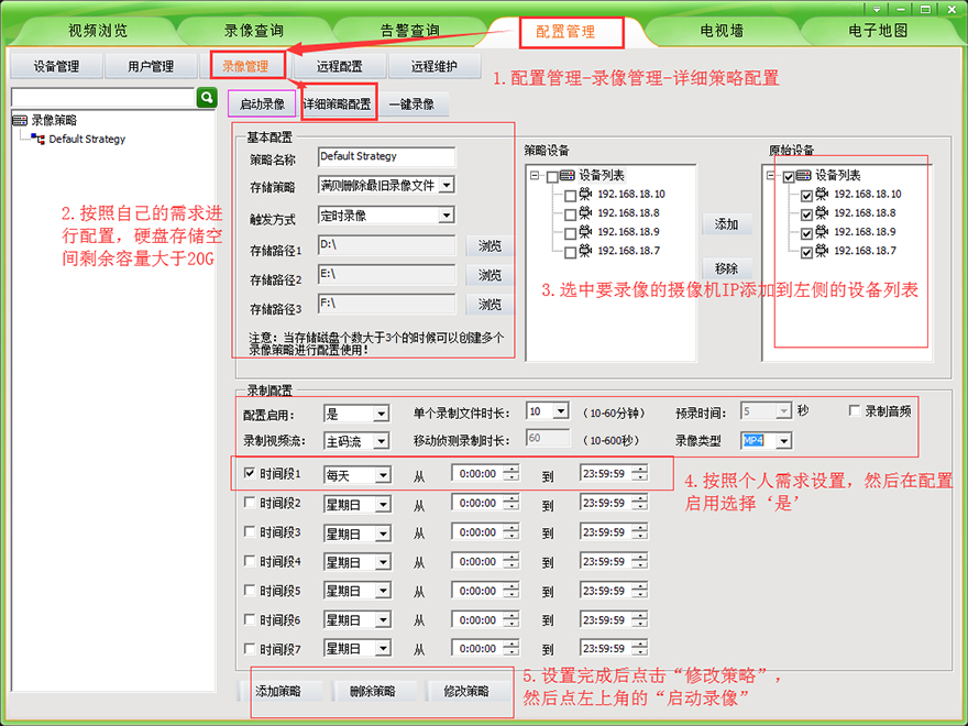 選擇好存儲策略、觸發(fā)方式、瀏覽存儲硬盤路徑、啟用配置、錄像碼流、時間段等,點擊修改策略即可啟動錄像。 默認部分參數(shù)已設(shè)置好, 如不修改只需要配置啟用選”是”后修改策略即可)