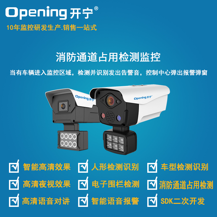 開寧AI智能消防通道占用監(jiān)控系統(tǒng)基于AI智能視頻分析算法,消防通道占用監(jiān)控系統(tǒng)自動檢測分析識別視頻圖像信息,不需要進(jìn)行人工干預(yù);識別監(jiān)控區(qū)域內(nèi)的消防通道是否有堵塞情況,當(dāng)發(fā)現(xiàn)異常情況以最快的方式給出預(yù)警,消防通道占用攝像頭發(fā)出語音提示(如“請勿停車占用生命安全消防通道”),并發(fā)送告警信息到后臺物業(yè)管理中心,或者是政府監(jiān)管部門指揮中心,當(dāng)開寧消防通道占用攝像頭告警語音勸退未成功時(shí),管理中心安排附近巡察人員前往處理。