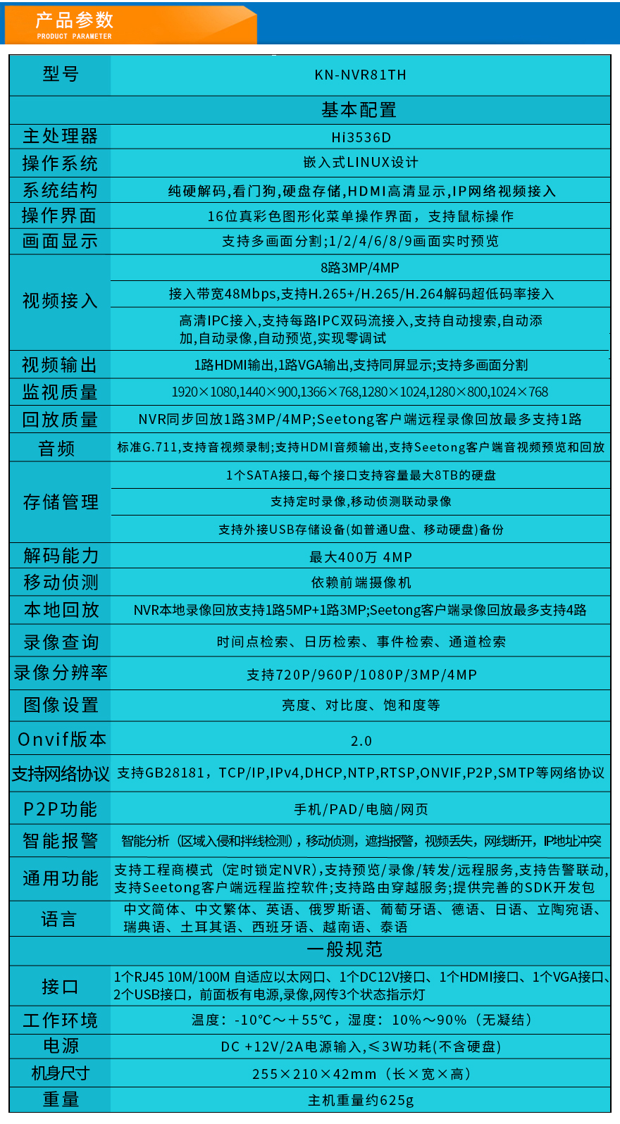 ★支持Seetong云/手機APP,1*SATA(8T),2*USB,1*100M,1*HDMI,1*VGA,1*DC輸入12V2A;電源輸入接口,<10W功耗;