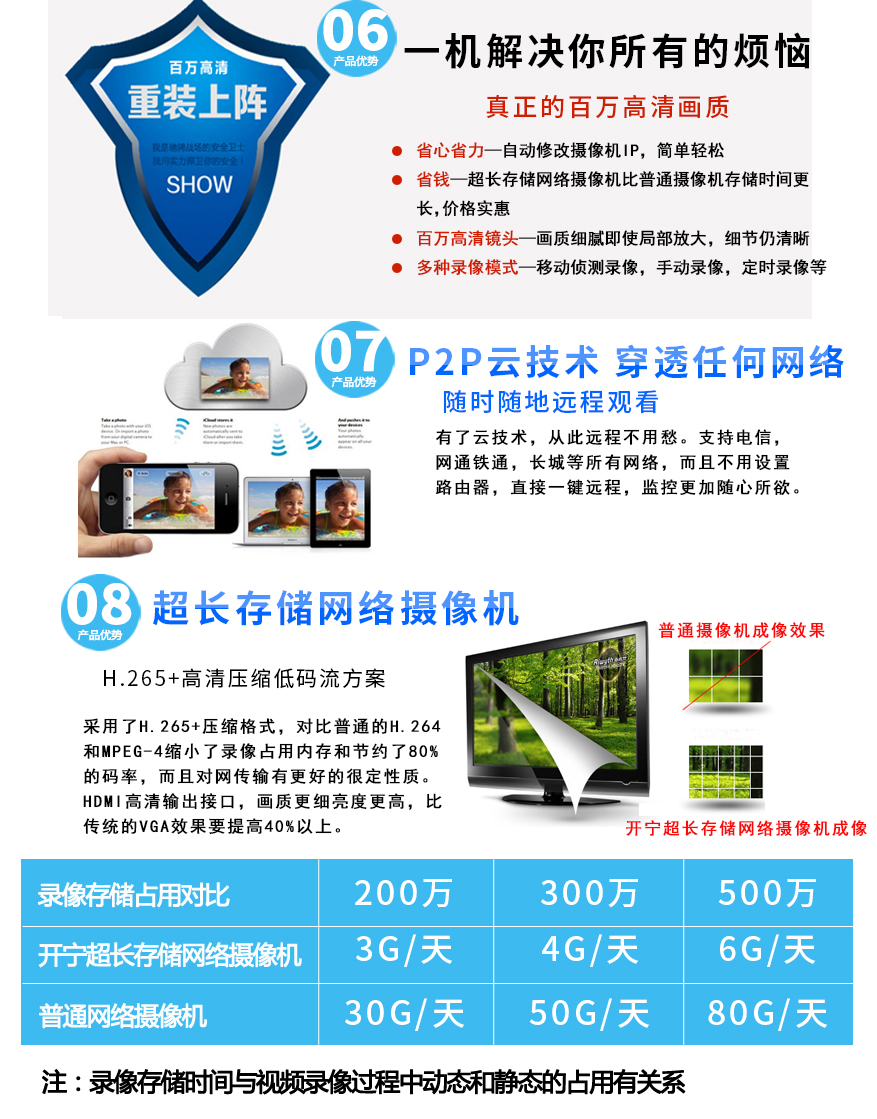 ★超長存儲網絡高清,1天只需10-20G存儲空間。