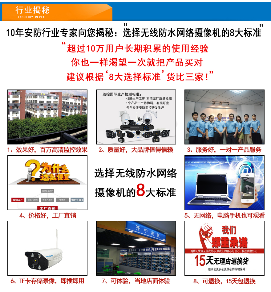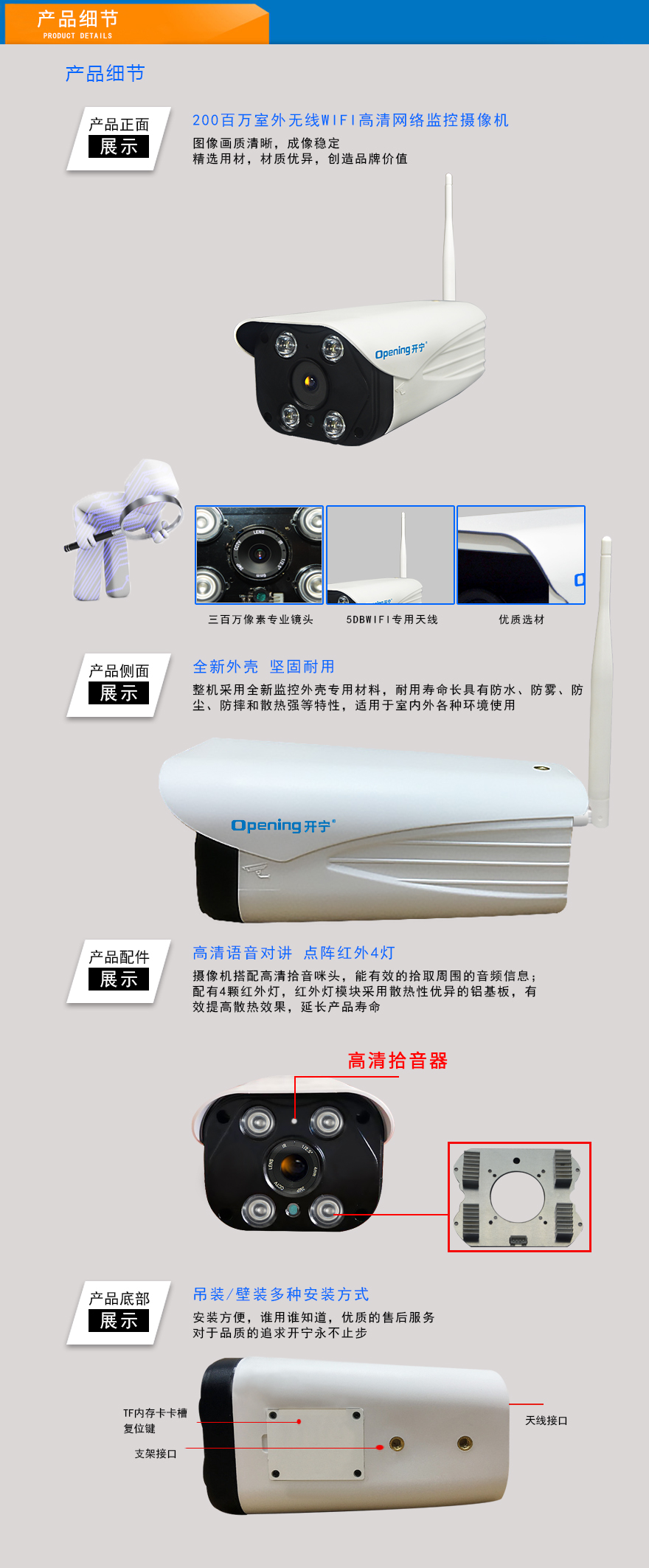 - 開(kāi)寧無(wú)線(xiàn)WIF防水網(wǎng)絡(luò)高清攝像頭,一個(gè)機(jī)器就相當(dāng)于一套監(jiān)控系統(tǒng);智能高清(960P/1080P),隨時(shí)隨地手機(jī)/電腦遠(yuǎn)程觀看;自帶AP(WIFI)熱點(diǎn),沒(méi)有網(wǎng)絡(luò)也可以正常使用;簡(jiǎn)易安裝,插內(nèi)存卡通電即用;4顆大功率點(diǎn)陣紅外燈,紅外10-30米左右,定焦鏡頭4MM,6MM可選),DC12V供電。