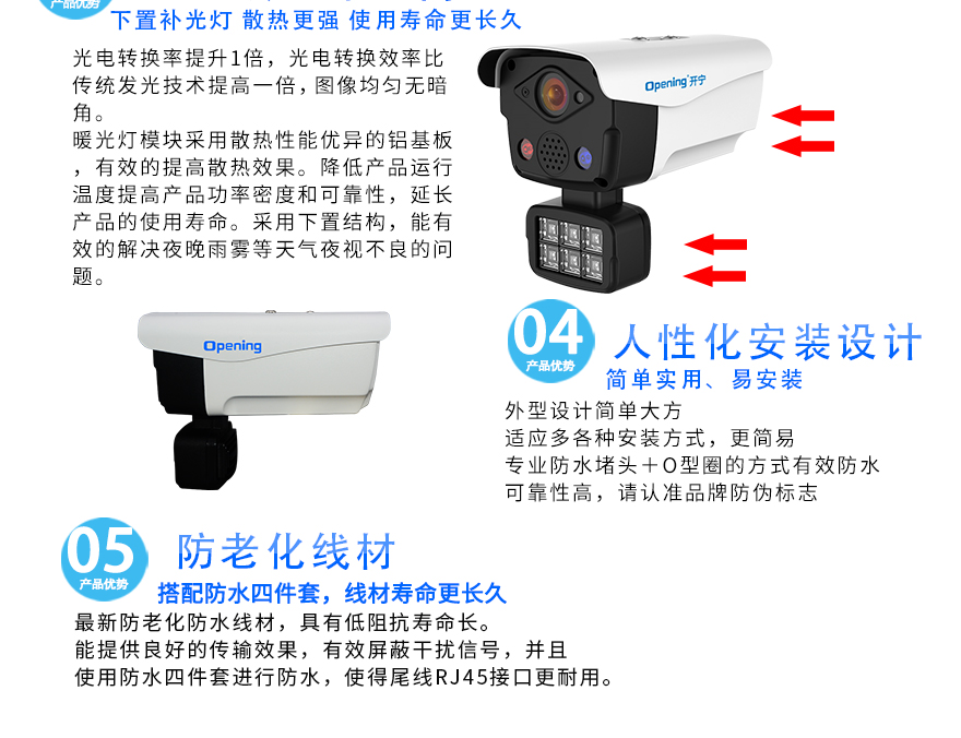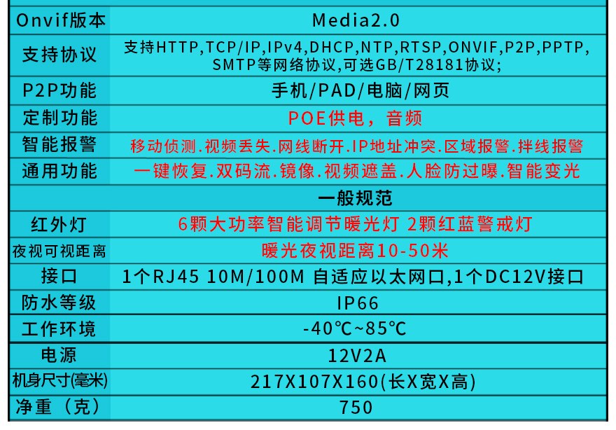 ★6顆晶元LED智能暖光陣列燈,2顆紅藍(lán)警戒燈,紅外15-50米,F(xiàn)1.0黑光專用高清定焦鏡頭/星光級專用高清監(jiān)控定焦專用鏡頭/超長存儲高清監(jiān)控專用鏡頭可選(4mm/6mm可選),IP66防水全金屬外觀,DC12V供電。