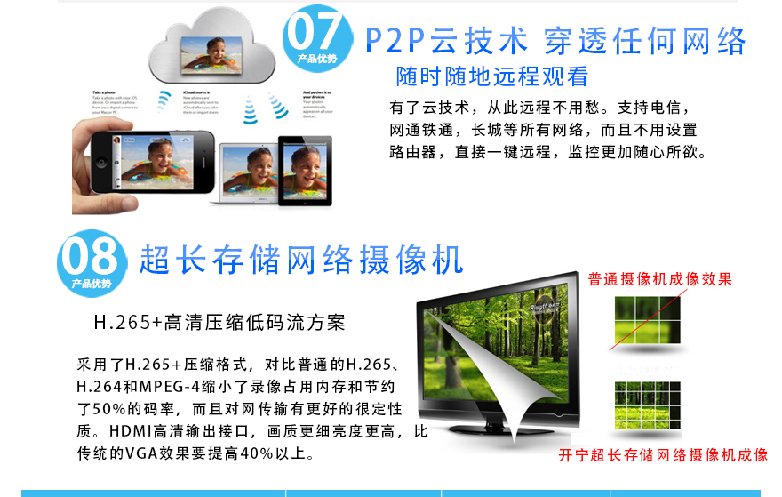 ★超長存儲、1080P(200萬)、智能高清、全網(wǎng)通、低碼流、低照度、低功耗、H.264+/H.265+雙碼流、防靜電、防浪涌、過壓保護、移動偵測報警。
