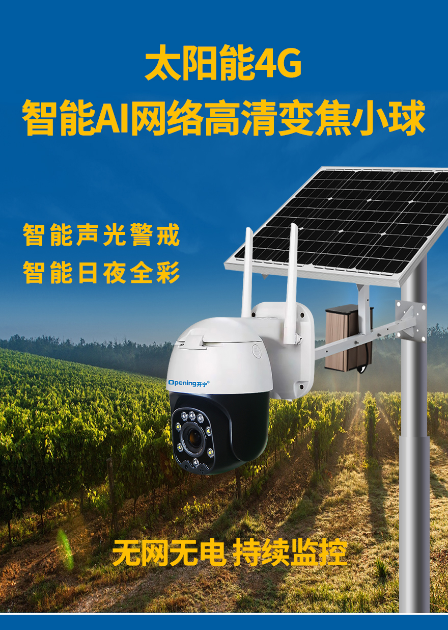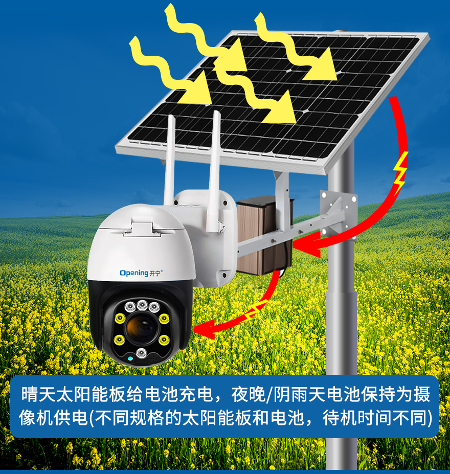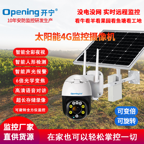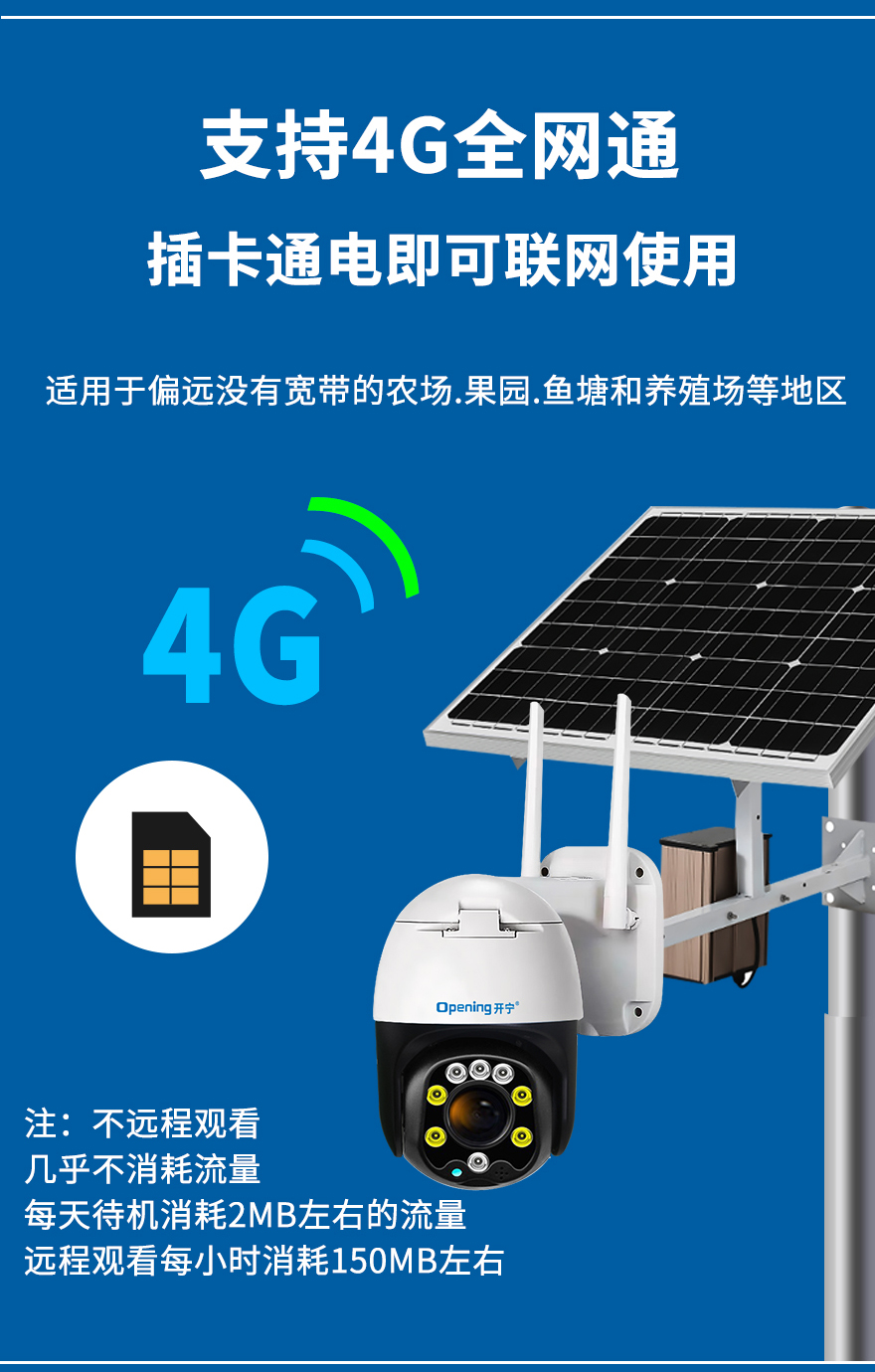 - ★這是一款開寧4G無線太陽能供電監(jiān)控系統(tǒng),一個機器就相當(dāng)于一套監(jiān)控系統(tǒng),無電無網(wǎng)也可以使用;