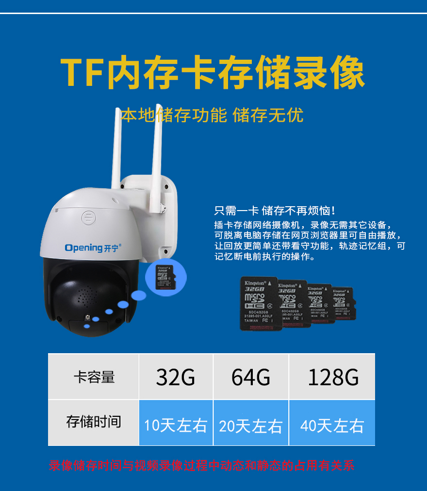★全天候環(huán)境設(shè)計,室外安裝,支持32/64/128G內(nèi)存卡(32GB以上需要使用FAT32格式化才能使用);