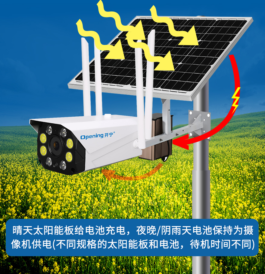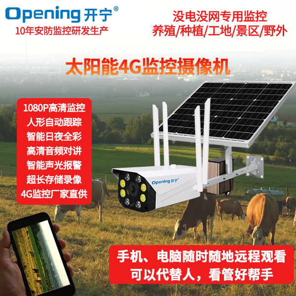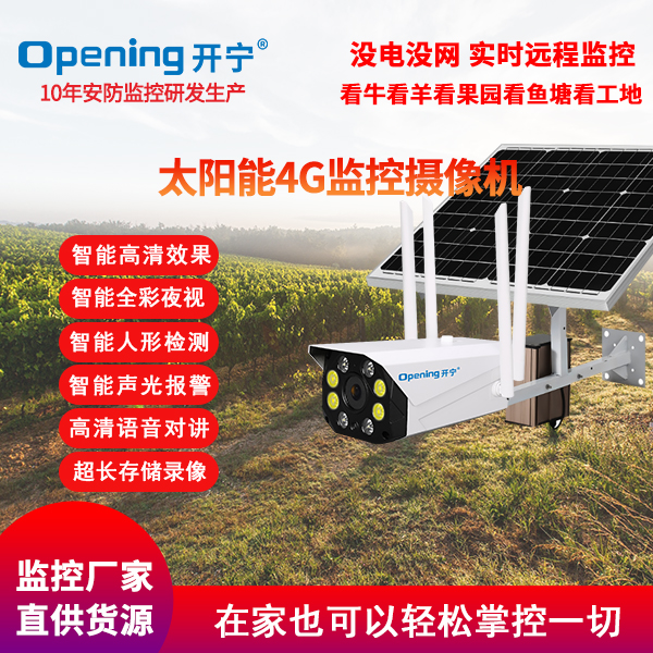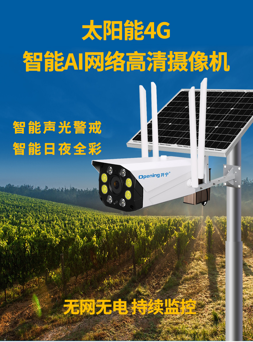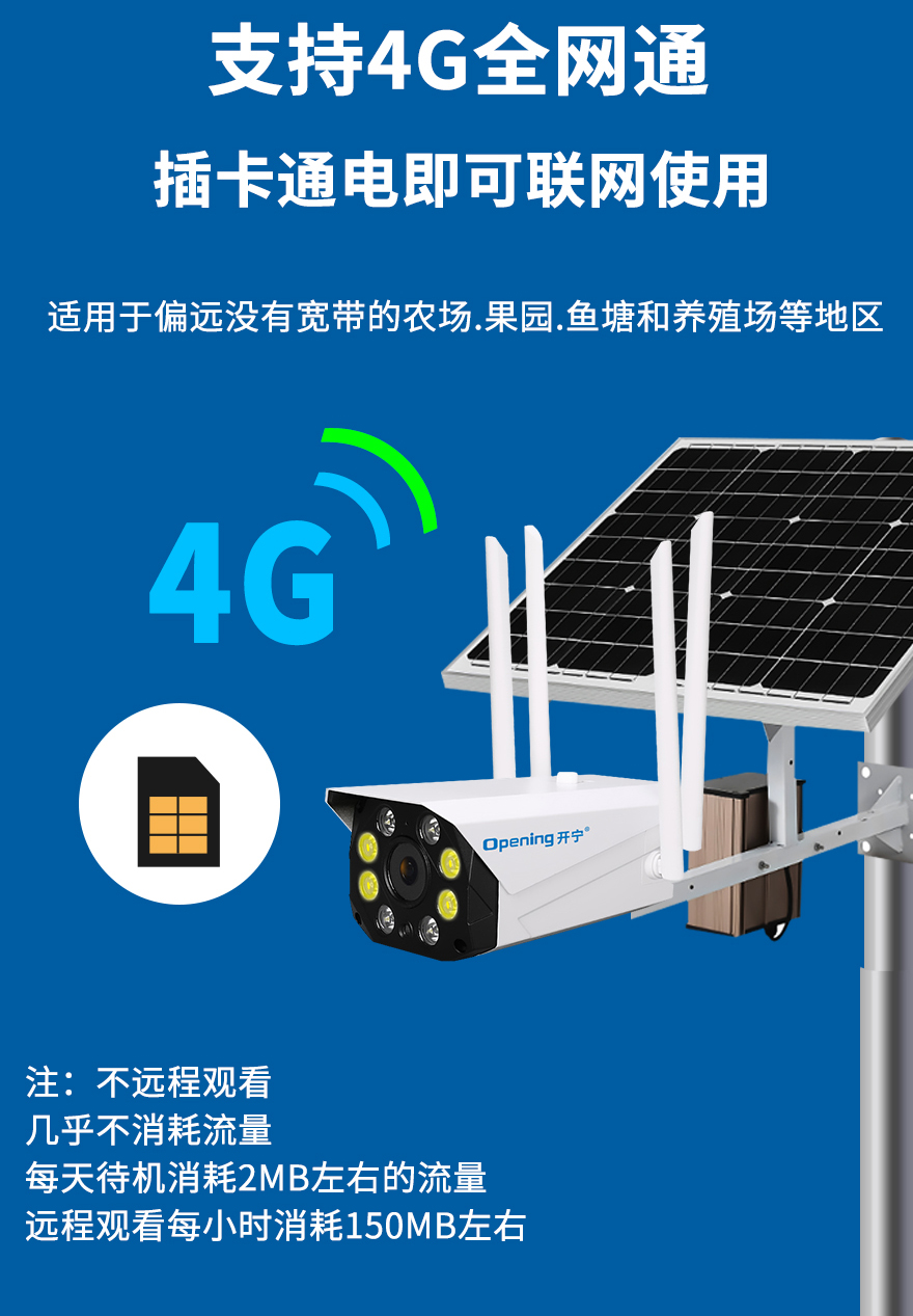 - ★這是一款開寧4G無線太陽能供電監(jiān)控系統(tǒng),一個(gè)機(jī)器就相當(dāng)于一套監(jiān)控系統(tǒng),無電無網(wǎng)也可以使用;