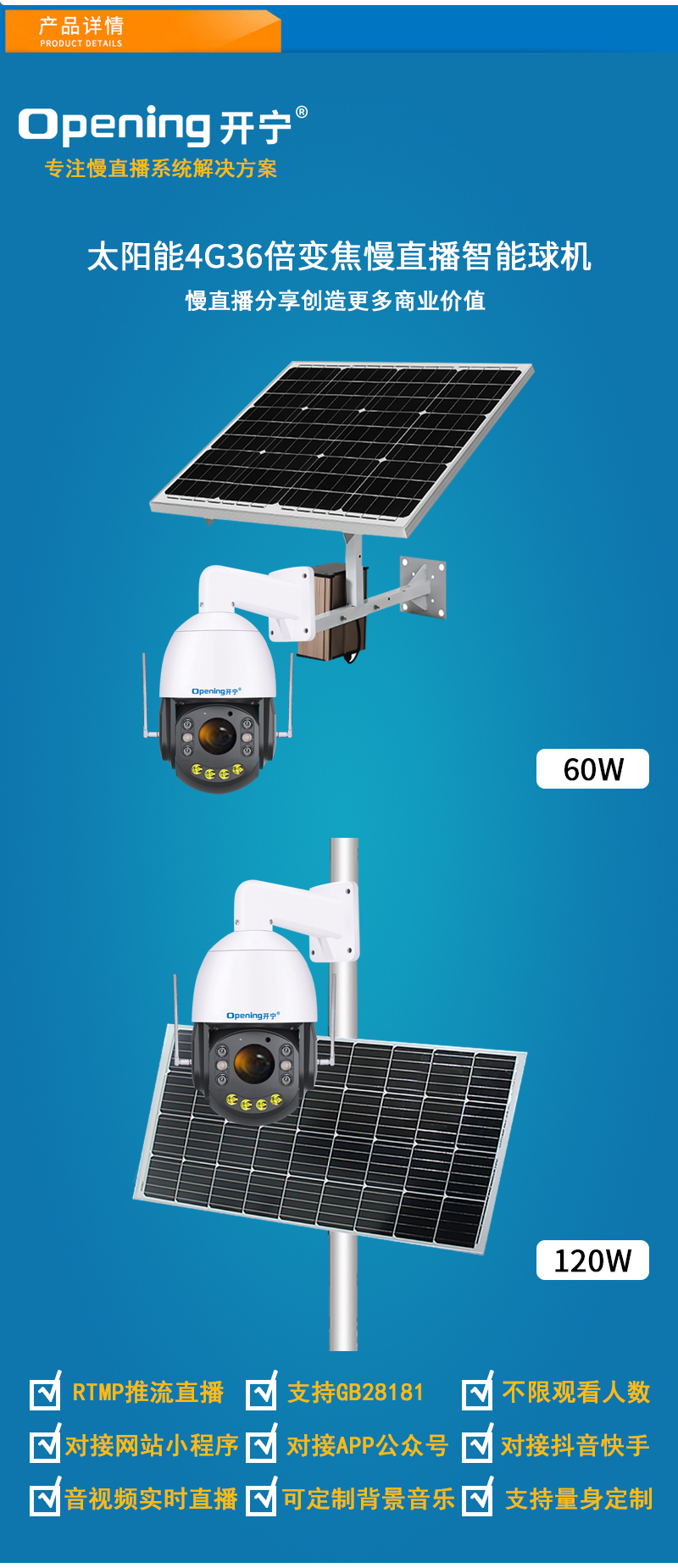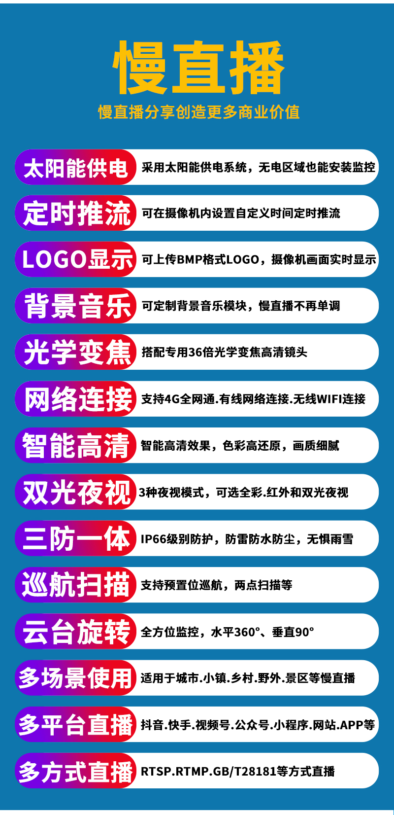 2、內(nèi)置智能4G模塊,沒有寬帶網(wǎng)絡(luò)的地方也能實現(xiàn)實時慢直播; 3、不僅可以監(jiān)控監(jiān)管錄像,還可以實時慢直播分享創(chuàng)造更多商業(yè)價值; 、4、美景中國.智慧景區(qū).城市慢直播.動物慢直播.融媒體慢直播.央視頻慢直播.戶外直播等慢直播;