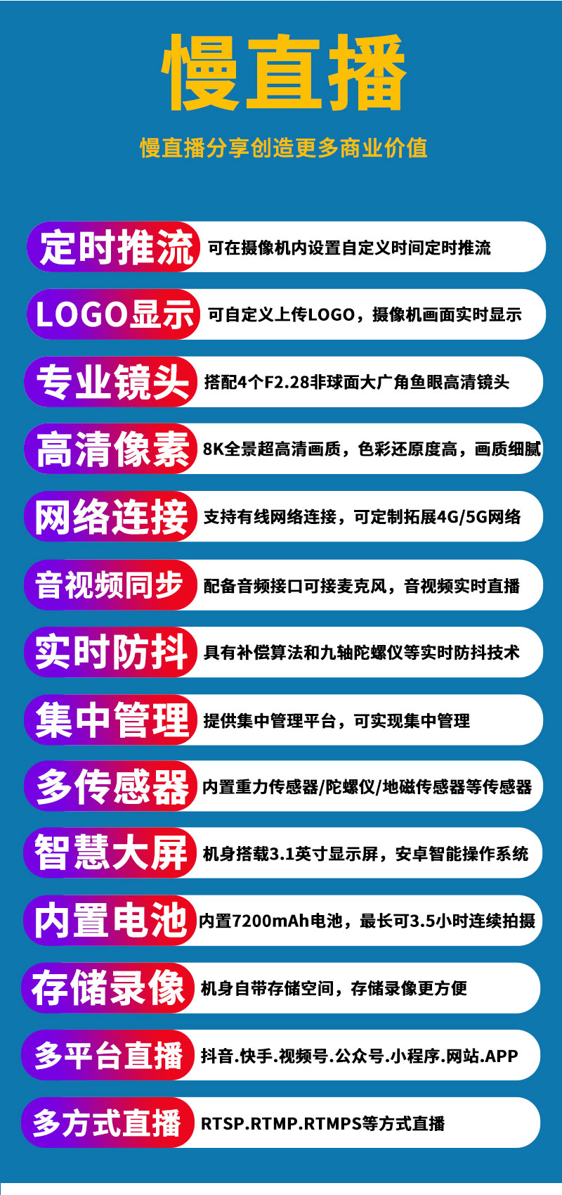5.支持4K 30fps機(jī)內(nèi)拼接直播,8K 24fps直播,8K 7fps機(jī)內(nèi)拼接錄制,支持H.265/H.264編碼,MP4格式視頻錄制,RTMP/RTMPS直播協(xié)議;