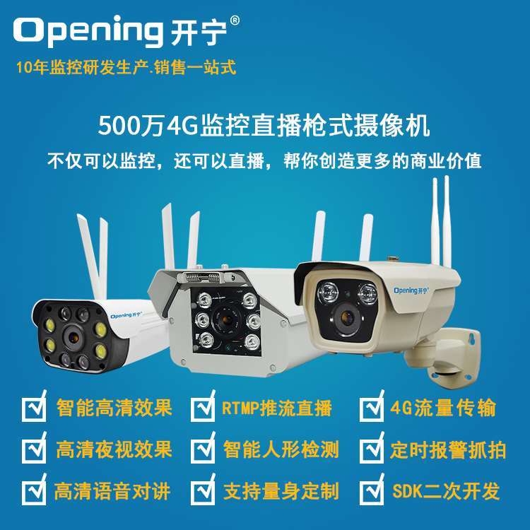 - 1、200萬/500萬4G智能監(jiān)控直播網(wǎng)絡(luò)高清防水?dāng)z像機(jī),一個(gè)攝像機(jī)就是一套監(jiān)控直播系統(tǒng);