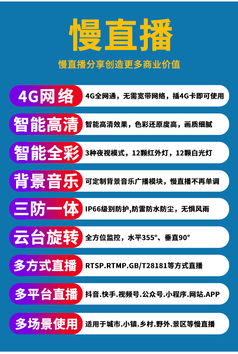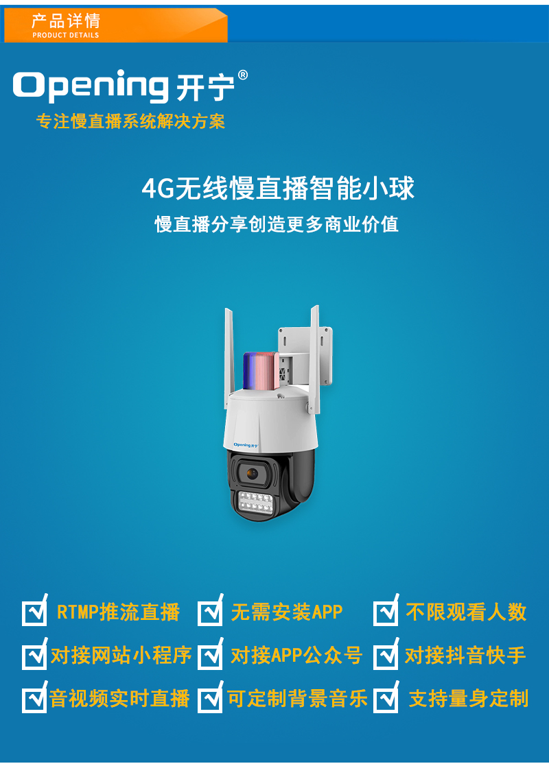 - 1、4G300萬慢直播智能小球,一個小球就是一套慢直播系統(tǒng); 2、不僅可以監(jiān)控監(jiān)管,還可以實(shí)時慢直播分享創(chuàng)造更多商業(yè)價值; 3、明廚亮灶.食品溯源.城市慢直播.美麗鄉(xiāng)村.農(nóng)業(yè)慢直播.景點(diǎn)慢直播.戶外慢直播等慢直播; 4、無需下載安裝APP,簡單實(shí)用;不限觀看人數(shù),創(chuàng)造更多商業(yè)價值; 5、RTMP推流直播高清攝像頭;可生成慢直播二維碼,只需掃碼即可觀看慢直播; 6、可接入網(wǎng)站.公眾號.小程序.APP;可對接抖音.快手.視頻號.淘寶.拼多多等平臺; 7、支持GB28181協(xié)議;可接公安.食品.工地.生產(chǎn).教育.畜牧.旅游等監(jiān)管部門平臺; 8、內(nèi)置智能4G模塊,沒有寬帶網(wǎng)絡(luò)的地方也能實(shí)現(xiàn)實(shí)時慢直播;另外支持有線功能; 9、支持64/128G/256G內(nèi)存卡;可另選配太陽能供電系統(tǒng)實(shí)現(xiàn)無電無網(wǎng)實(shí)時慢直播; 10、12顆高效能點(diǎn)陣紅外燈,12顆高效能點(diǎn)陣白光燈,鏡頭4MM/6MM可選,夜視5-50米; 11、APP可選擇紅外模式、全彩模式和智能模式三種模式其中一種模式; 12、智能模式,沒有物體移動紅外燈亮,有物體移動白光燈亮; 13、內(nèi)置高清拾音器,有聲有色實(shí)時直播;高清晰喇叭,APP語音對講,語音警戒報警;DC12V供電; 14、免費(fèi)提供集中管理平臺,可實(shí)現(xiàn)集中管理慢直播攝像頭,有效提高工作效率;