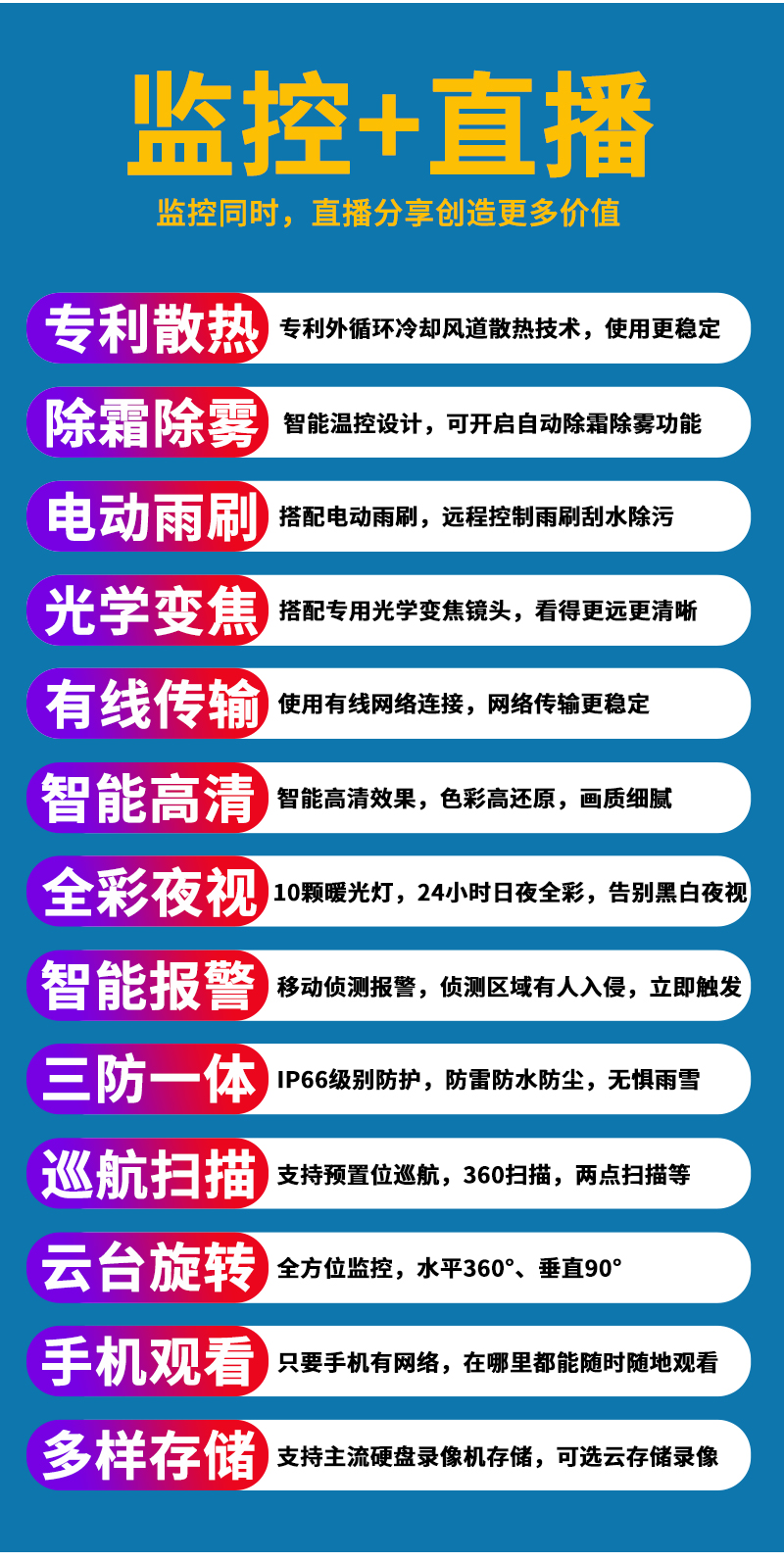 3、自動除霜、除霧功能(手動開啟),外置雨刷設(shè)計(jì),確保視頻高清畫面更清晰;