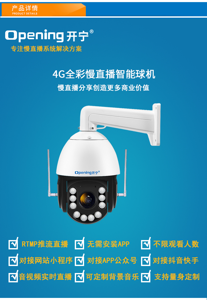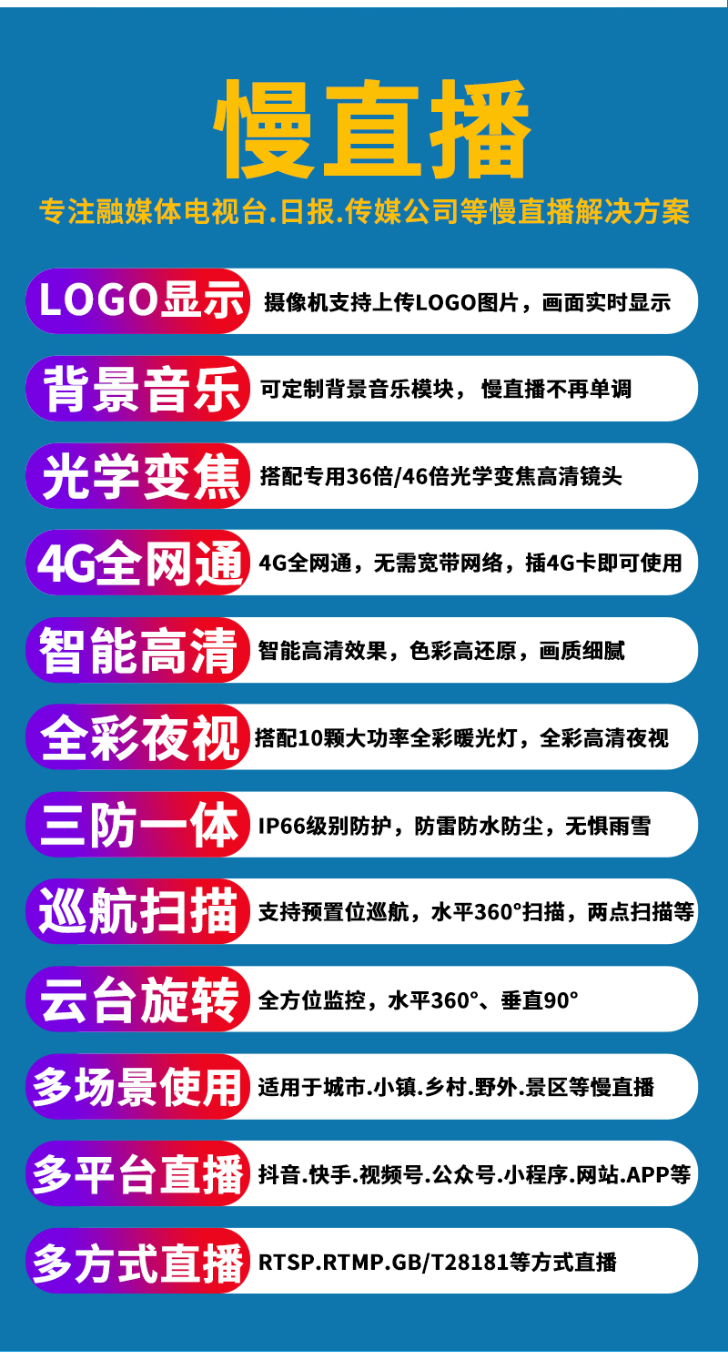 - 1、500萬/800萬6寸4G全彩慢直播智能球機,一個球機就是一套慢直播系統(tǒng);支持360度旋轉(zhuǎn),36倍/46倍光學(xué)變焦,半金屬外觀,IP66防水等級;