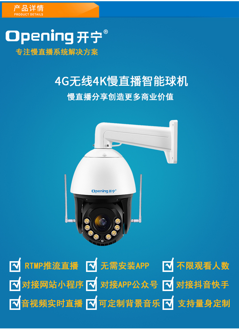 - 1、500萬/800萬7寸4G全彩慢直播智能球機(jī),一個球機(jī)就是一套慢直播系統(tǒng);支持360度旋轉(zhuǎn),36倍/46倍光學(xué)變焦,金屬外觀,IP66防水等級;