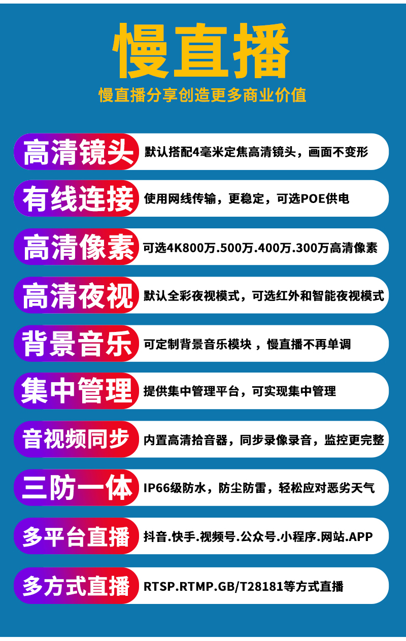 - 1、300萬/500萬/800萬/1200萬雙光慢直播無畸變高清攝像機,一個攝像機就是一套慢直播系統(tǒng);