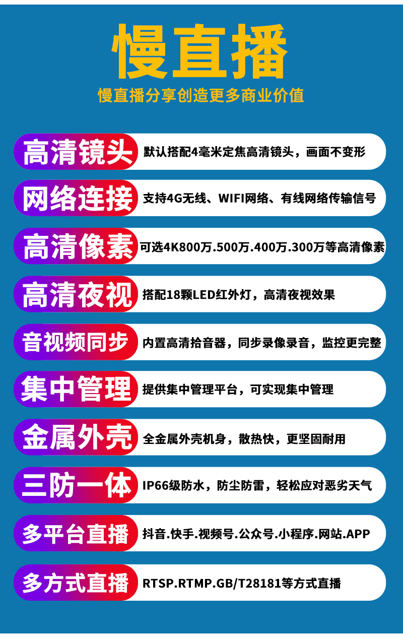 8、高清慢直播、本地錄像錄音、報(bào)警多功能于一體;支持64/128G/256G內(nèi)存卡;