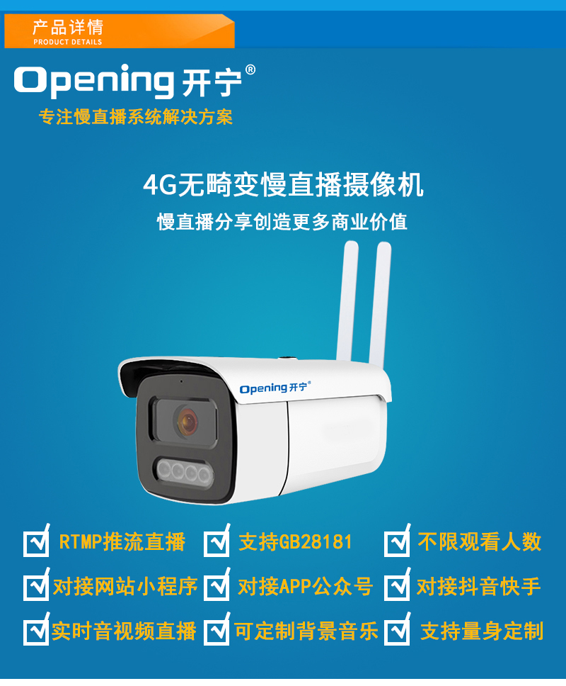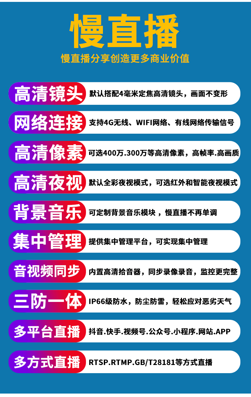 - 1、4G300萬/500萬/4K800萬/1200萬慢直播智能全彩高清攝像機(jī),一個(gè)攝像機(jī)就是一套慢直播系統(tǒng);
