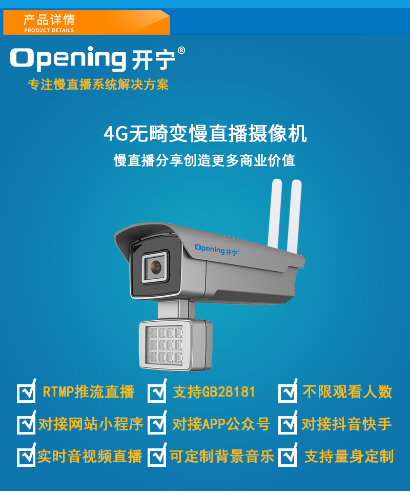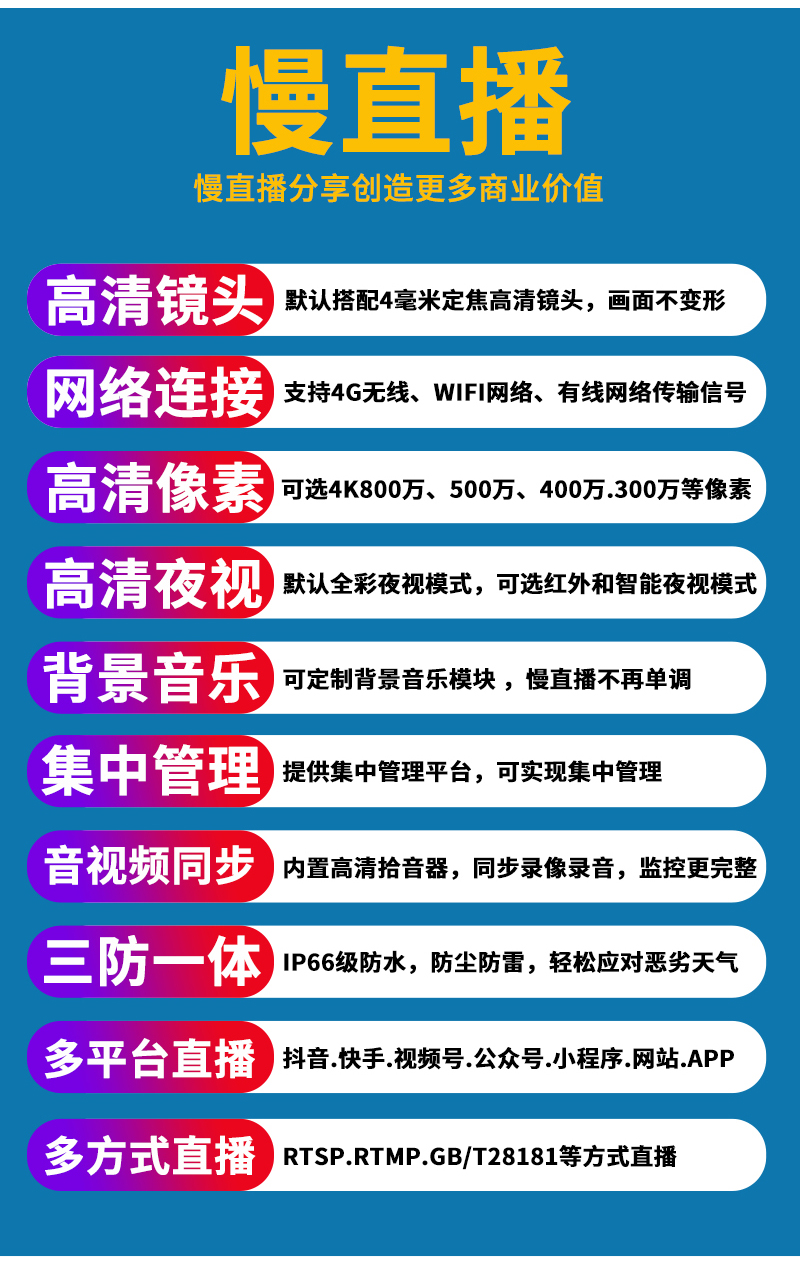 - 1、4G300萬/500萬/800萬/1200萬無畸變雙光慢直播高清攝像機(jī),一個(gè)攝像機(jī)就是一套慢直播系統(tǒng);