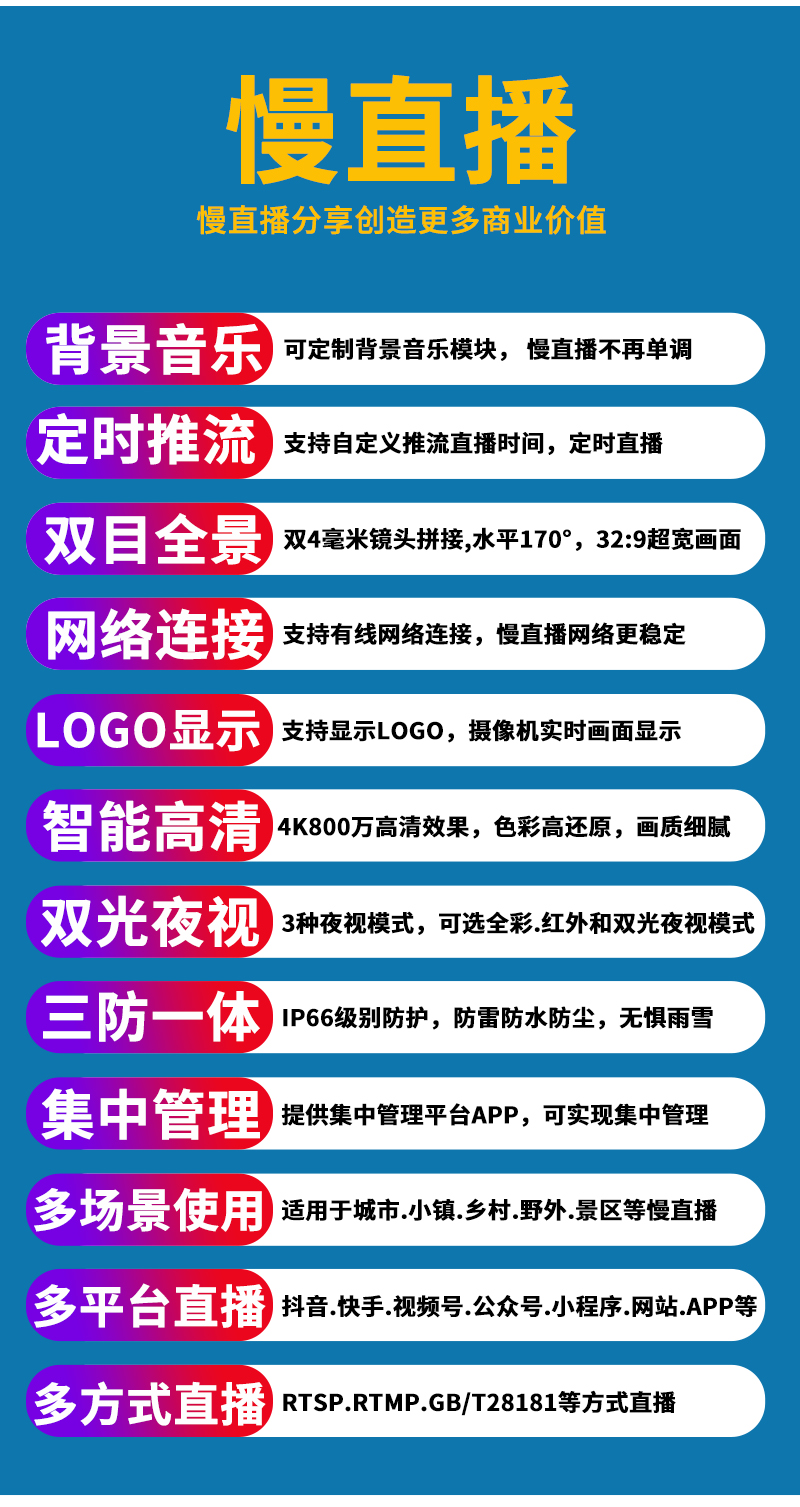 3、景點(diǎn)直播.美麗鄉(xiāng)村.城市慢直播.農(nóng)業(yè)慢直播.文旅慢直播.融媒體慢直播.戶(hù)外直播等慢直播;