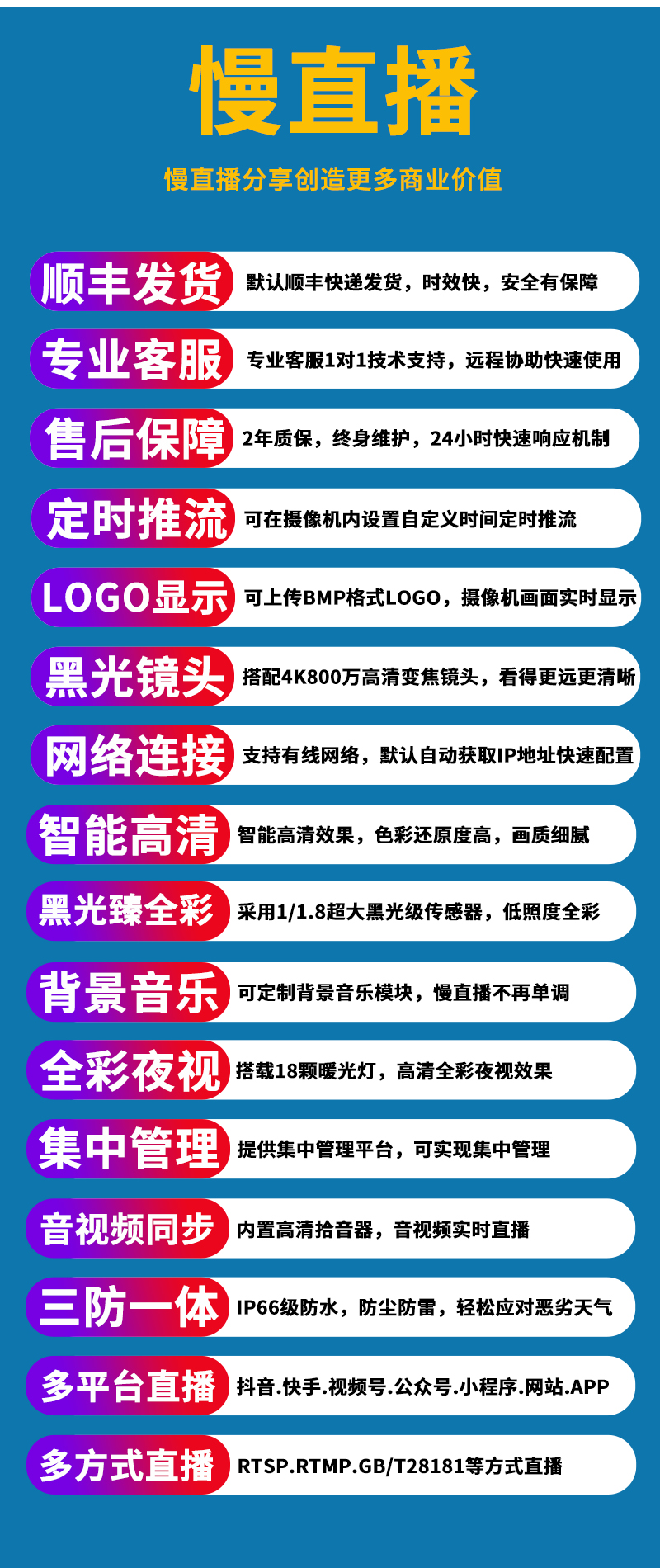 - 1、500萬/800萬1/1.8黑光臻全彩全彩慢直播高清攝像機,一個攝像機就是一套慢直播系統(tǒng);