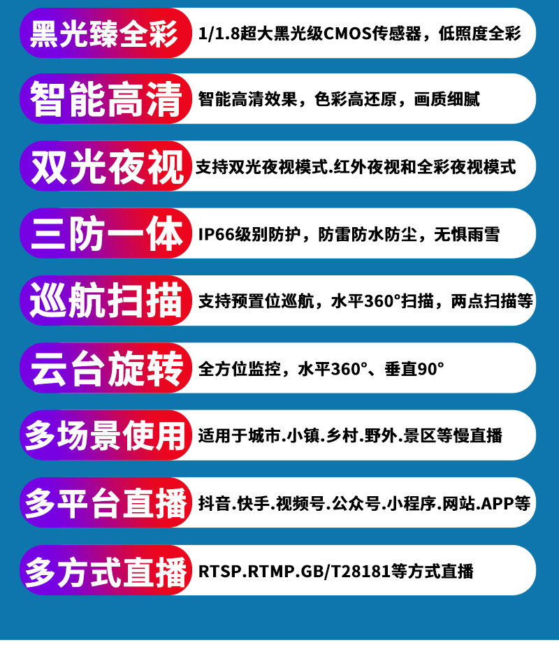 - 1、4K800萬(wàn)6寸20倍雙光全彩慢直播智能球機(jī),一個(gè)球機(jī)就是一套慢直播系統(tǒng);水平360度無(wú)限位旋轉(zhuǎn),垂直100度旋轉(zhuǎn);支持256個(gè)預(yù)置位 8組巡航8組掃描,支持水平掃描,2點(diǎn)區(qū)域掃描,隨機(jī)掃描;20倍光學(xué)變焦,2倍數(shù)字變倍,金屬外觀,IP66防水等級(jí);
