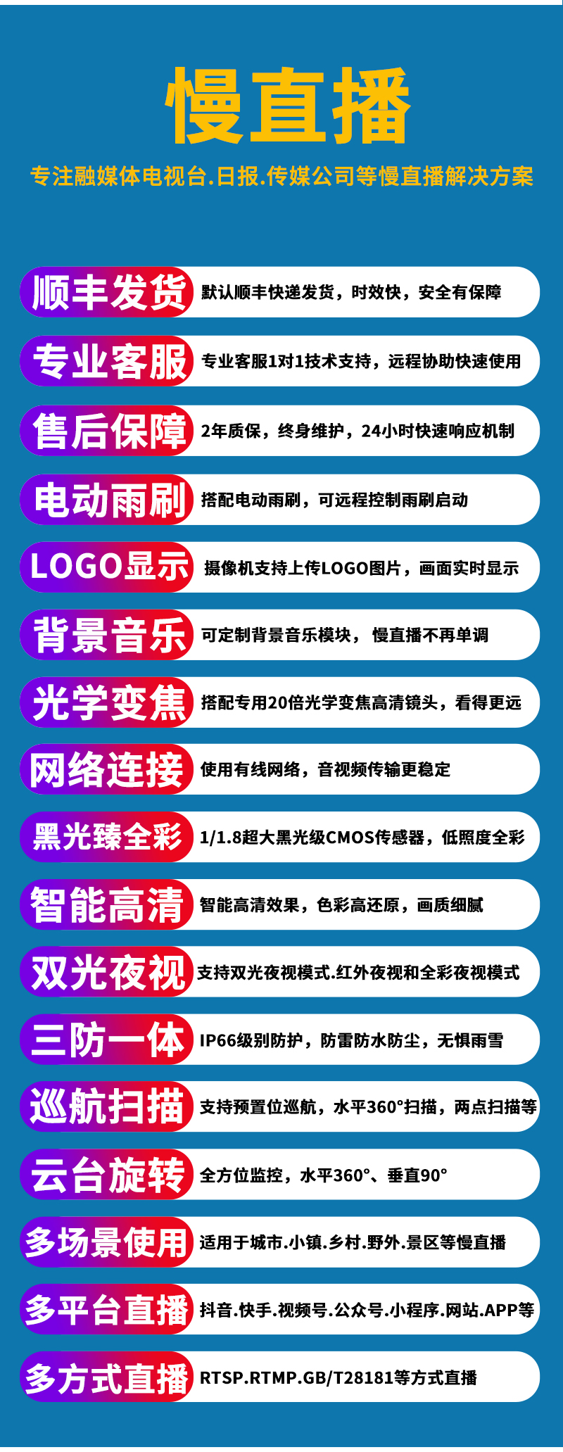 - 1、4K800萬6寸36/48倍雙光全彩慢直播智能球機,一個球機就是一套慢直播系統(tǒng);水平360度無限位旋轉,垂直100度旋轉;支持256個預置位 8組巡航8組掃描,支持水平掃描,2點區(qū)域掃描,隨機掃描;20倍光學變焦,2倍數(shù)字變倍,金屬外觀,IP66防水等級;